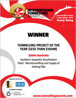 In December of 2011 Züblin Australia was awarded the prestigious title of ‘Tunnelling Project of the Year’ for the Southern Seawater Desalination Plant Project in Western Australia.